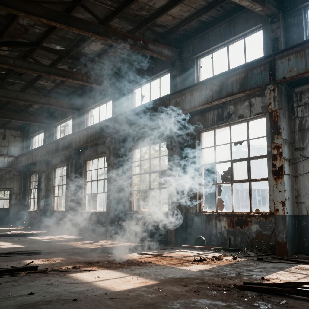 Add smoke to photo of an abandoned factory interior, dusty beams of light pierced by drifting smoke creating a cinematic effect, emphasizing texture on rusty metal surfaces and broken windows with soft contrast.