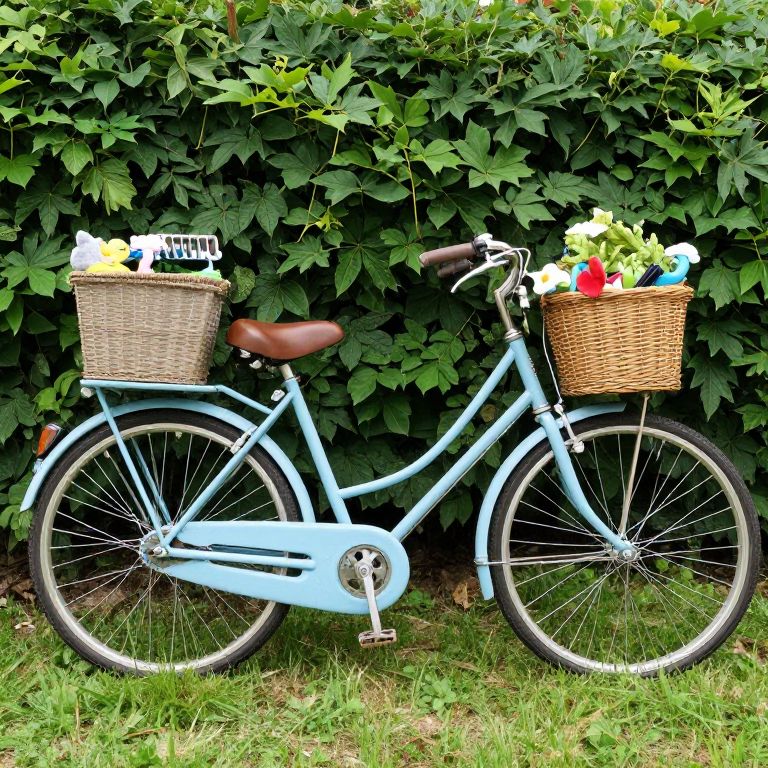 Vibrant red bicycle with a wicker basket perched on its handlebars stands gracefully against a rustic wooden wall backdrop, accompanied by four colorful balloons—red, orange, gold, and white—floating above and tethered to its frame, all set upon a textured stone floor.
