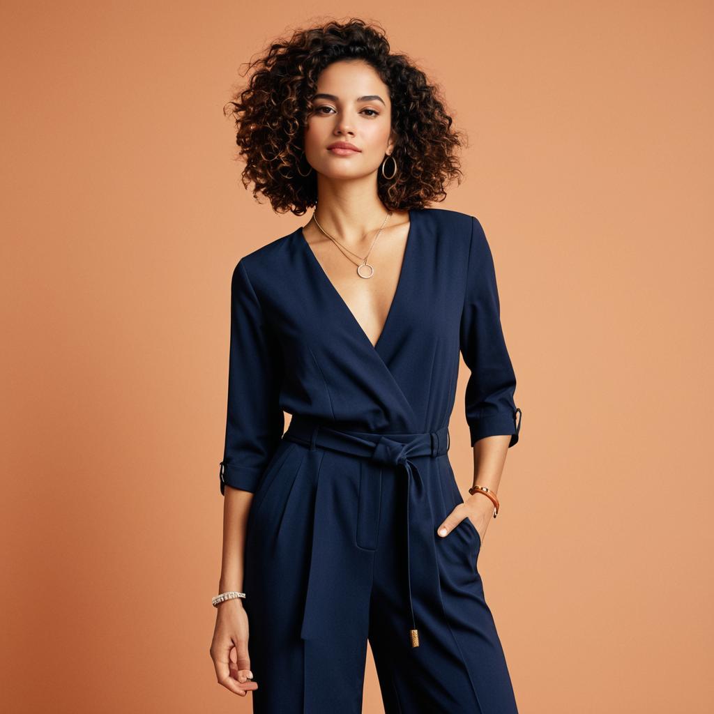 Woman, contemporary chic, tailored jumpsuit in deep navy blue, V-neckline, three-quarter sleeves, cinched waist with tie belt, wide-leg pants, minimal jewelry with a delicate necklace, bracelet, and ring, hair in natural curls, plain pastel orange background.