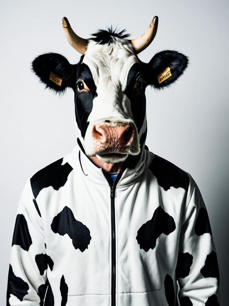 Man in Cow Suit costume, cinematic realism, professional studio portrait
