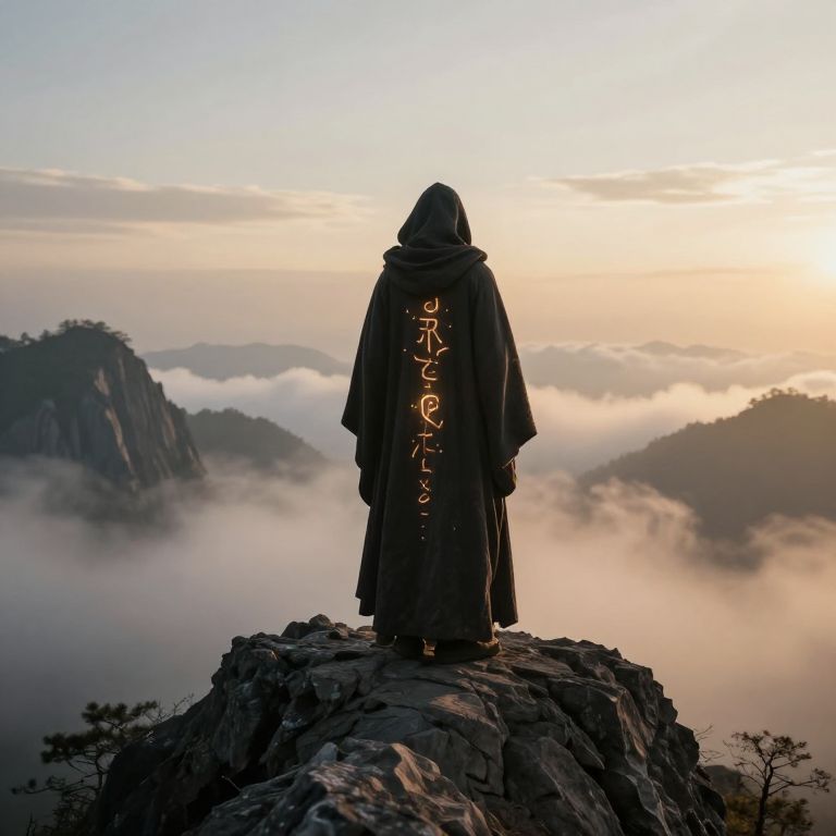 Shown, a mysterious cloaked figure standing atop a rugged mountain at dawn, soft golden light illuminating swirling mist, with intricate ancient runes glowing faintly on their robe, dramatic fantasy landscape, highly detailed, epic atmosphere