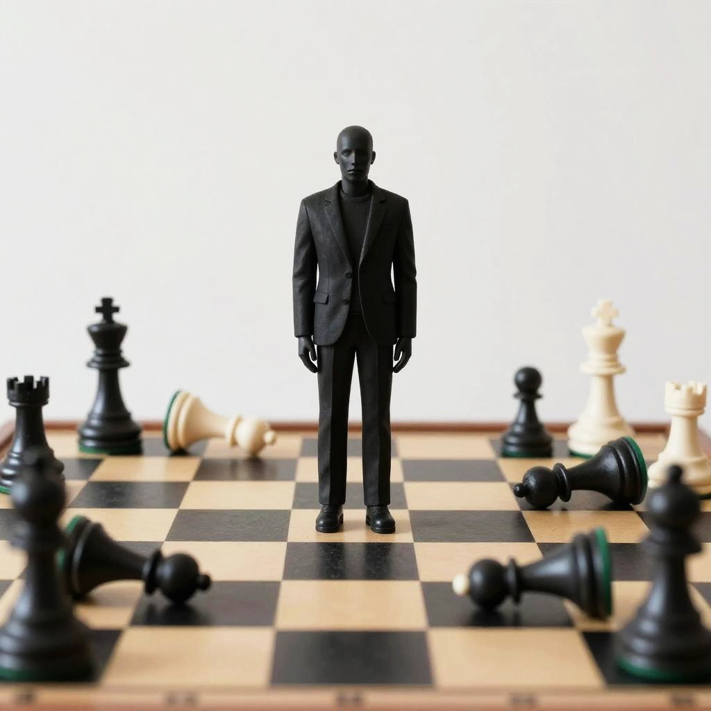 Photograph of a black, featureless, mannequin-like figure in a dark suit standing on a checkered chessboard. The figure is centered, with chess pieces scattered around; black pieces are in the foreground, white pieces in the background. The chessboard has black and white squares, and the pieces are in various positions, some upright and some fallen. The background is a stark white, emphasizing the contrast with the dark suit and chessboard. The image has a high-contrast, almost surreal style.