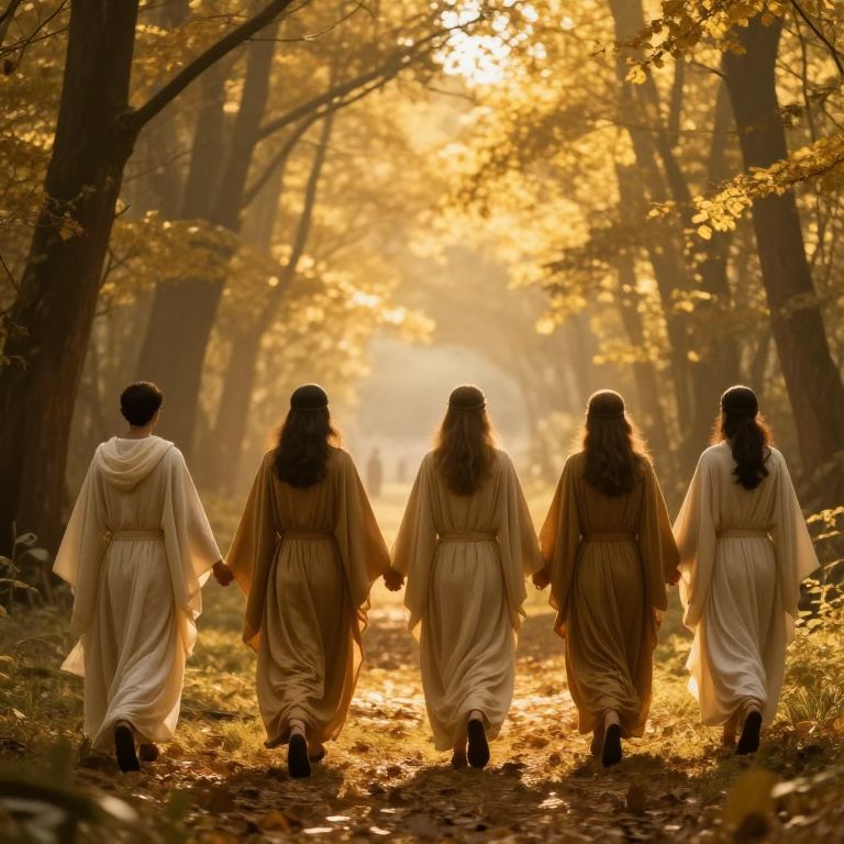 Photograph of four women walking hand in hand through a golden-lit forest during autumn. They are dressed in flowing, white, ancient Greek-style robes with belted waists and dark headscarves. The path is covered in fallen leaves, and the sunlight filters through the tall trees, creating a warm, ethereal glow. The women's backs are to the camera, and their shadows stretch ahead on the path. The background shows a dense array of trees with golden leaves, adding to the serene and mystical atmosphere.