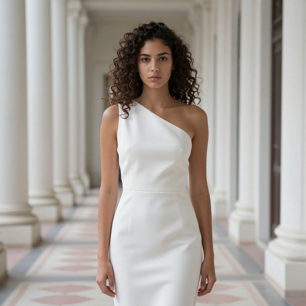 Photograph of a young woman with curly, dark brown hair standing in a classical, colonnaded hallway. She's wearing a simple, elegant, white, one-shoulder dress that drapes gracefully over her slim frame. Her expression is serious and focused. The background features tall, white columns and a patterned floor in soft shades of pink and gray. The lighting is natural, highlighting her features and the texture of the dress.