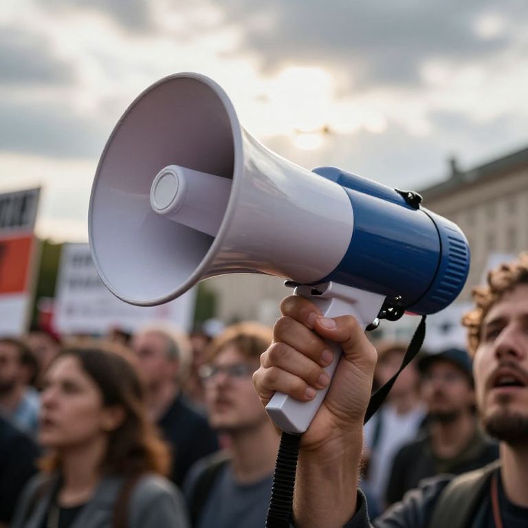 A close-up of a person's hands gripping a megaphone, surrounded by a sea of faces in a tense but non-violent protest, with sunlight breaking through the clouds above
