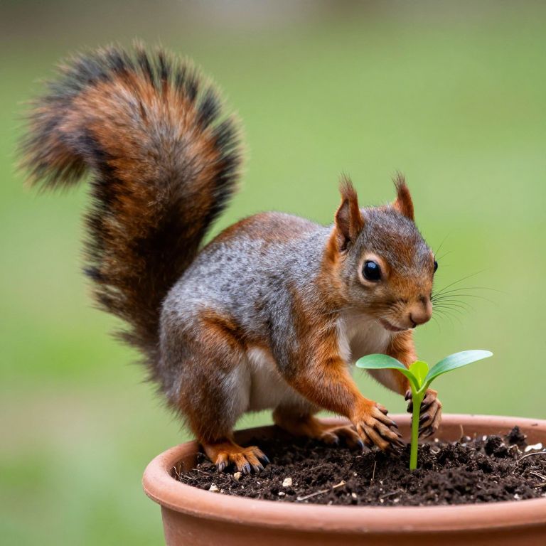 Curious squirrel gently tending to a small potted plant, its fluffy tail arched high as it examines the green sprout emerging from rich soil.