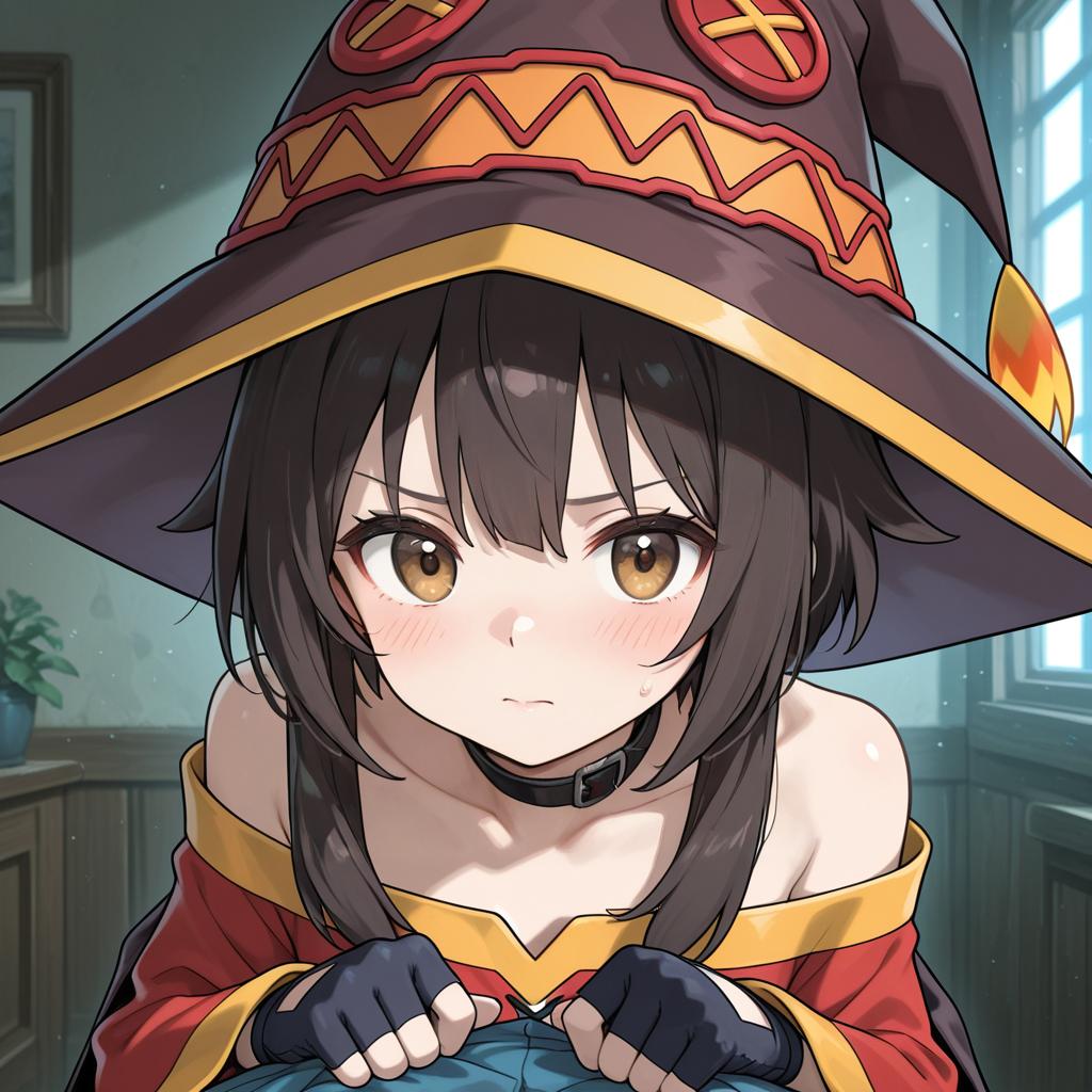 Arcane style, megumin, 1girl, bare shoulders, black cape, black gloves, black hair, blush, cape, choker, collarbone, dress, hair between eyes, hat, long sleeves, looking at viewer, medium hair, off-shoulder dress, off shoulder, red dress, red eyes, sidelocks, solo, witch hat, indoors