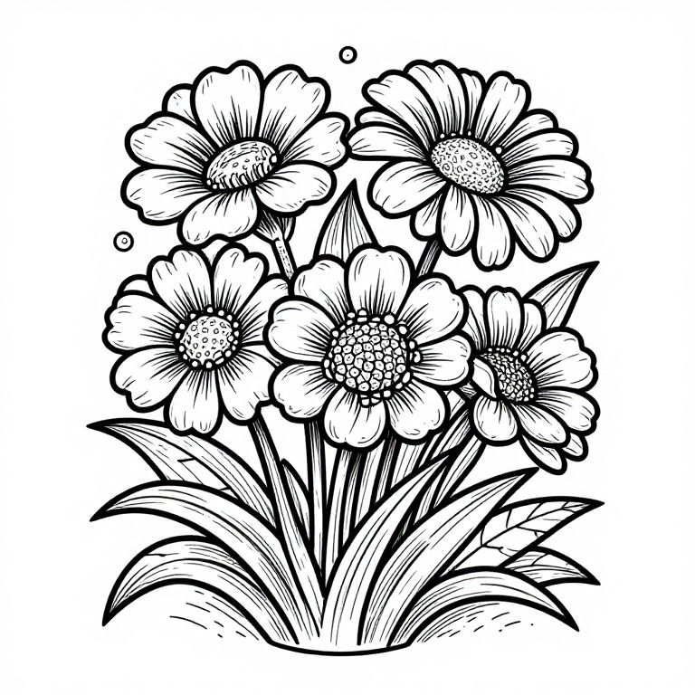 Black and white line drawing of six detailed, large flowers with textured petals and intricate centers, surrounded by elongated leaves.