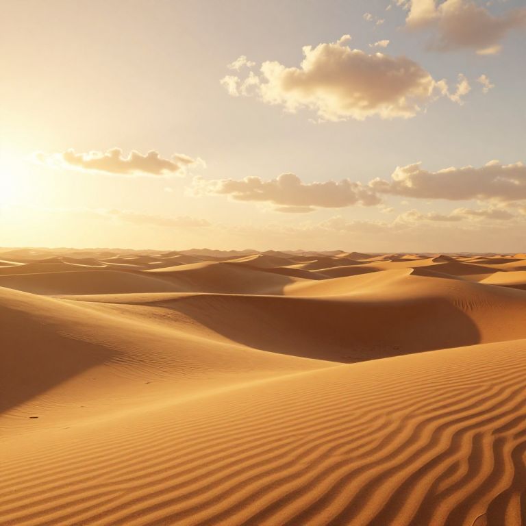 A serene 3D-rendered desert landscape bathed in the warm glow of golden hour sunlight, where sand dunes stretch endlessly under a sky dotted with clouds, evoking a sense of timeless mystery and cosmic wonder.