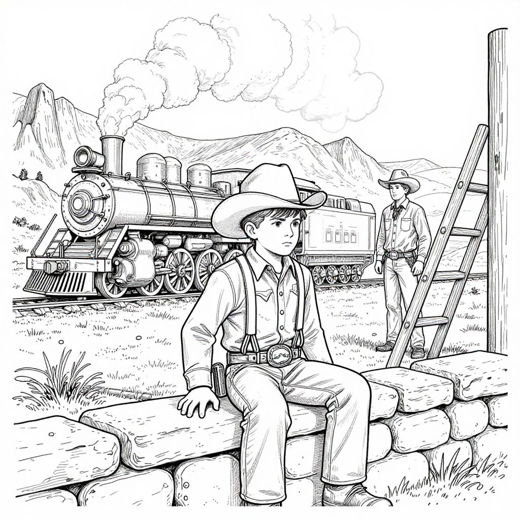 The image is a black and white coloring page depicting a scene from the old west. In the foreground, a young boy wearing a wide-brimmed cowboy hat, a buttoned-up shirt, suspenders, and a belt with a large buckle is sitting on a stone wall. His expression is serious, and he is looking off to the side. To his right, there is a wooden ladder leaning against a wooden post. In the background, a steam locomotive with multiple smokestacks and large wheels is stationed on a track, suggesting a mining operation. Another man, also dressed in a cowboy hat and a buttoned-up shirt, stands near the locomotive, observing the scene. The landscape features rugged terrain with rocky outcrops and sparse vegetation, adding to the wild west atmosphere. The overall composition is balanced, with the boy and the locomotive creating a focal point, while the other elements provide context and depth to the scene.