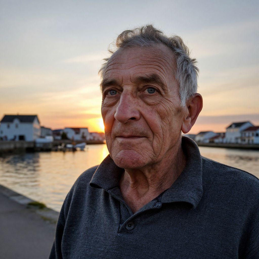 Imagine a highly detailed portrait of an aged fisherman, his sun-wrinkled skin a testament to years spent under the open sky. With shy blue eyes, framed by deep laugh lines, he exudes both wisdom and resilience. Standing at the serene edge of a coastal town, he's bathed in the warm glow of a setting sun, casting golden light on his proud yet worn features. From an intriguing worm's-eye view perspective, focus on capturing the intricate textures of his seafaring attire and the fine lines etched into his face, evoking introspection and appreciation for life's fleeting moments. This emotional gradient is intensified by the vibrant sunset colors juxtaposed against the quiet gray tones, creating a peaceful atmosphere that resonates with contemplation.