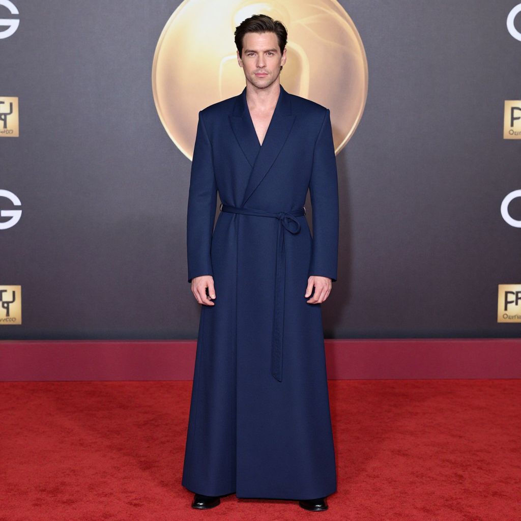 Dark Blue Costume, man in a blue robe standing in front of a red carpet