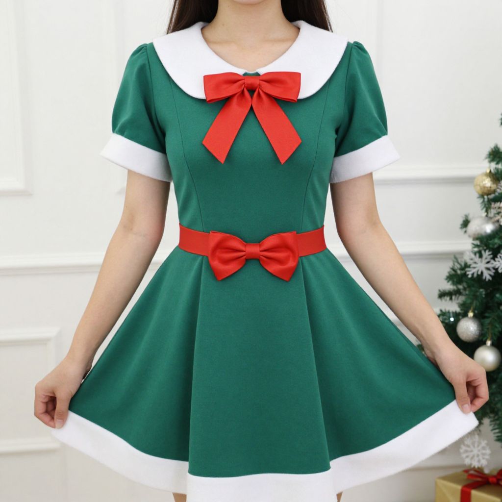 "Woman Green Santa Dress, woman in green dress with red bow and white collar"