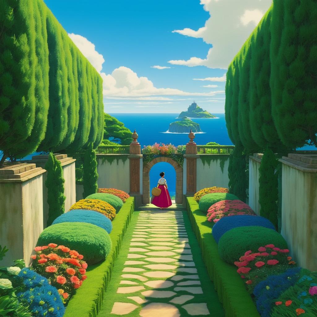 Illustration of a woman wearing a vibrant red traditional dress with gold trim walking up stone steps in a lush, colorful garden filled with blooming flowers and trimmed green trees. The scene features a bright blue sky with clouds and an expansive view of distant mountains and water, evoking a serene and dreamy atmosphere reminiscent of Studio Ghibli's animation style.