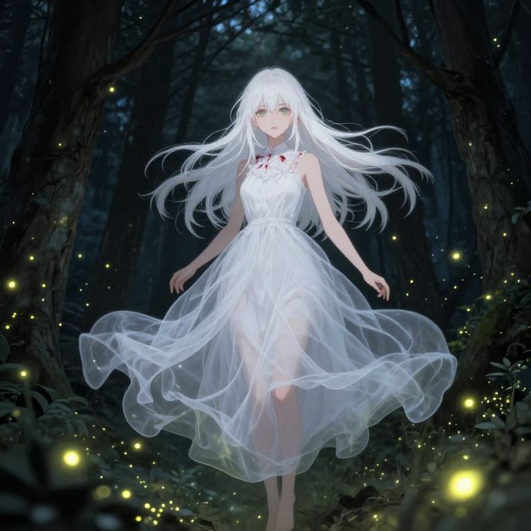 Delicate white haired vampire girl anime with ethereal beauty, floating in a mystical dark forest surrounded by glowing fireflies, flowing white dress with translucent layers, subtle blood stains on collar, soft pastel colors mixed with deep blacks, dreamlike and haunting ambiance