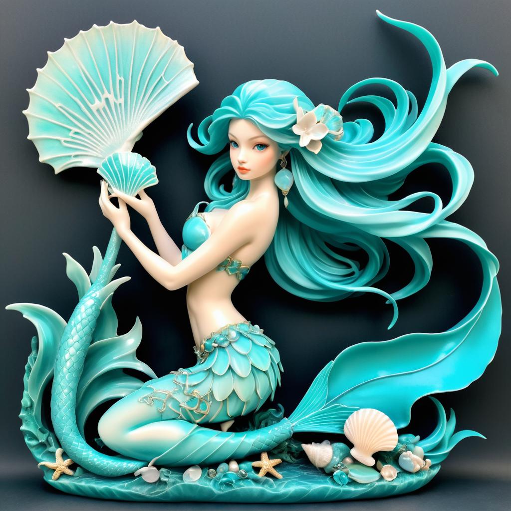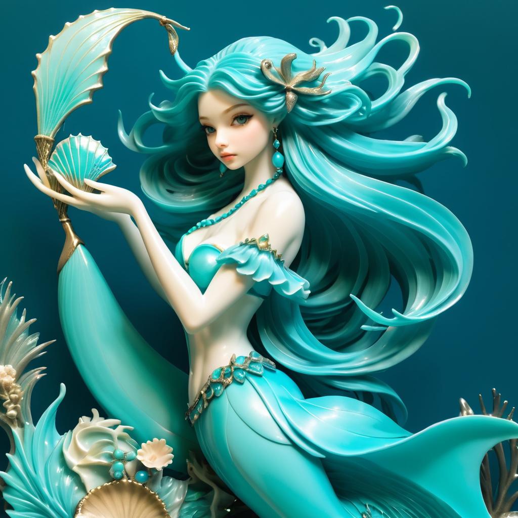 High-detail figurine of a beautiful mermaid with a flowing turquoise tail and hair, holding a seashell. The mermaid features delicate facial details, aquatic-themed accessories, and a fantasy style inspired by Claire Wendling's artistry. Set against a dark fantasy background, emphasizing the mermaid's vibrant colors and intricate design.