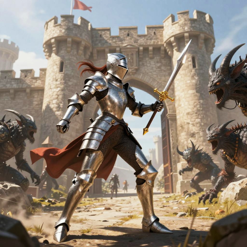 Kojima Castlevania art showcasing an epic battle scene with armored heroes and monstrous creatures, dark palette with striking red accents, highly detailed textures