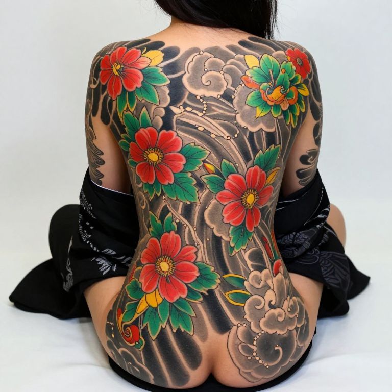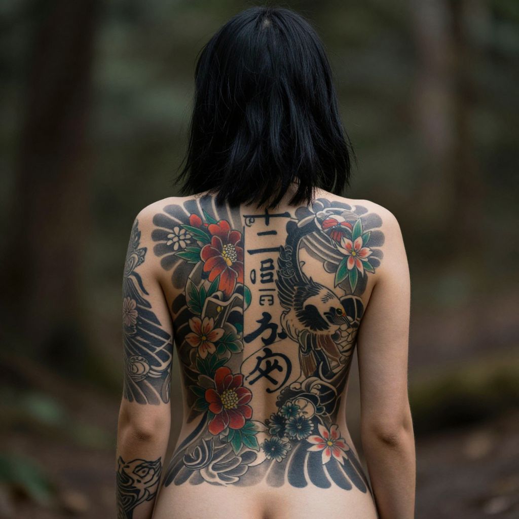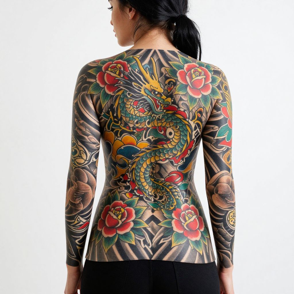 Photograph of a tattooed woman with a large, colorful, detailed snake and dragon back tattoo, seated on a bed, being helped with her hair