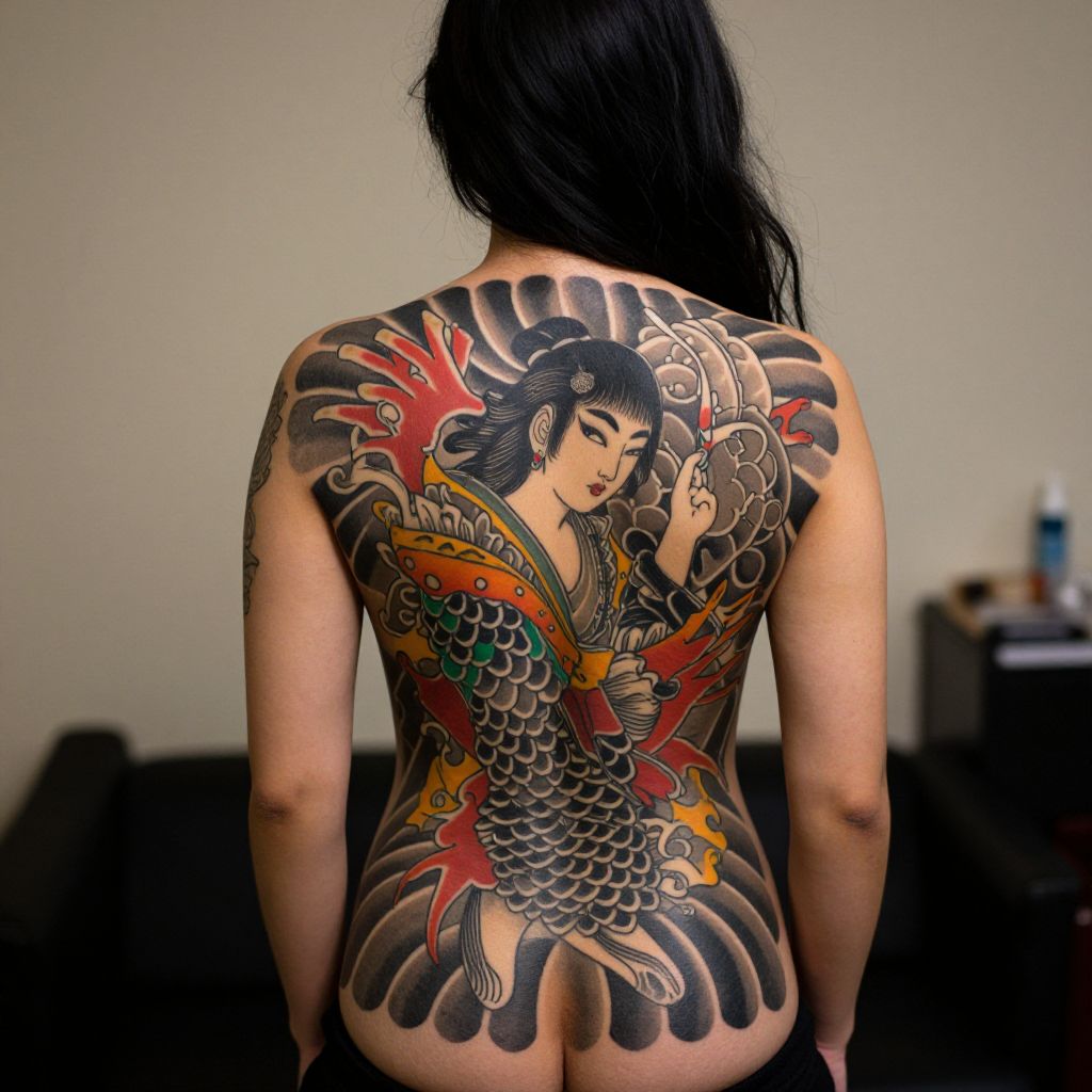Photograph of a person with a large, intricate back tattoo featuring colorful, detailed artwork of a snake and a fierce face. The person is sitting on a bed, facing away, with their hair being styled up by someone's hands. The background includes soft, gray curtains and a bright window. The tattoo is vibrant and elaborate, with dark green, red, and gold hues.