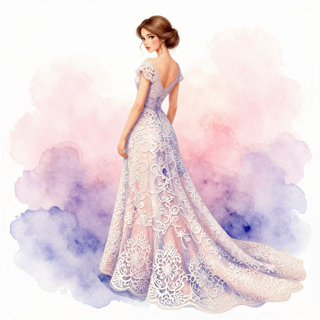 Watercolor illustration of a woman wearing a graceful, flowing lace dress with intricate floral patterns. The woman is shown from behind, highlighting the delicate lacework and the long train of the dress. Soft pastel background in shades of pink and purple enhances the dreamy, ethereal quality of the artwork. The woman has light skin, brown hair styled in a loose updo, and a refined, poised stance.
