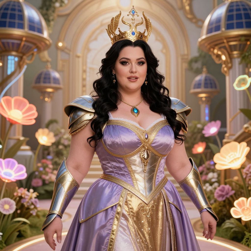 A confident plus size royal queen woman with dark wavy hair and bright eyes stands in a futuristic royal garden where neon-colored flowers and solar domes blend with traditional royal motifs. She wears a regal costume combining futuristic armor elements with a flowing lavender and gold gown — complete with a crown shaped like a stylized crown and phoenix motif — her face showing strength and grace under warm golden lighting.. The woman has big breasts and cute face