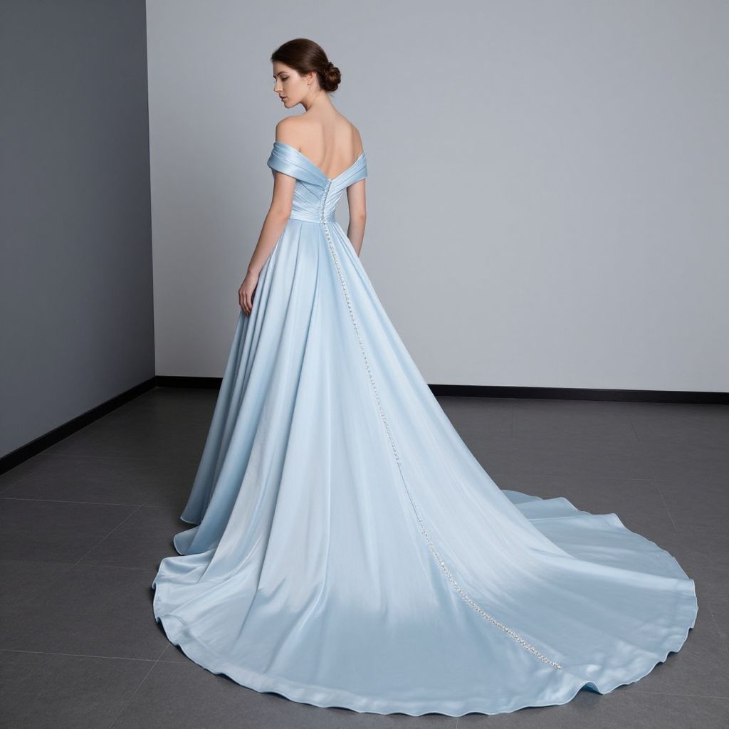 Photograph of a woman in an off-the-shoulder, light blue satin wedding gown with a long train, standing in a minimalist gray room.