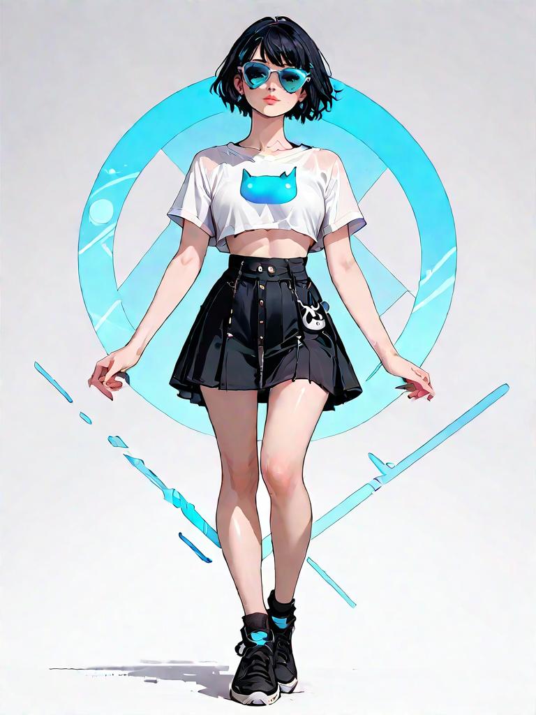 1girl, source_comics, realistic face, full body shot, Woman, casual chic, grey graphic print sweatshirt with long sleeves, crew neck, featuring portrait design, paired with a black faux leather mini skirt, flared silhouette.