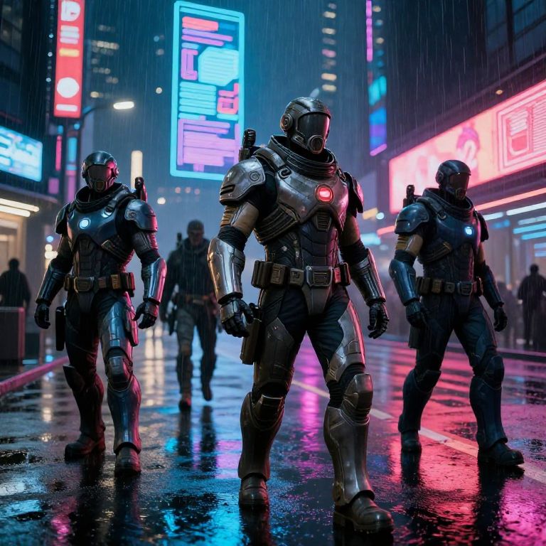 Muun bounty hunter in sleek armor standing on a rocky outcrop overlooking a cyberpunk cityscape at sunset, dramatic sky, detailed textures, neon reflections on wet streets, intense atmosphere, concept art style, digital painting.