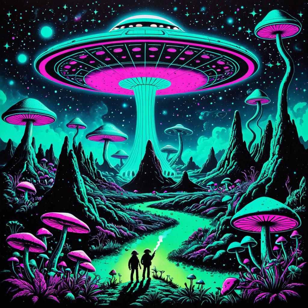 Vintage 70s black light poster of little green men, smoking joints, alien landscape, UFO flying saucers, psilocybin cubensis mushrooms, vibrant trippy colors, glowing magenta and cyan, nebula swirls and fractal arrays