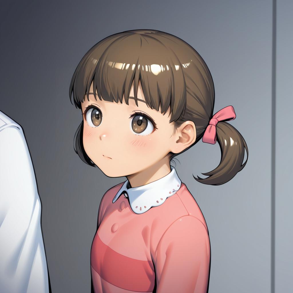 Doujima nanako, persona, 1girl, brown eyes, brown hair, short hair, short twintails, twintails, hair ribbon, child, by artist dyun, dark_illustrious