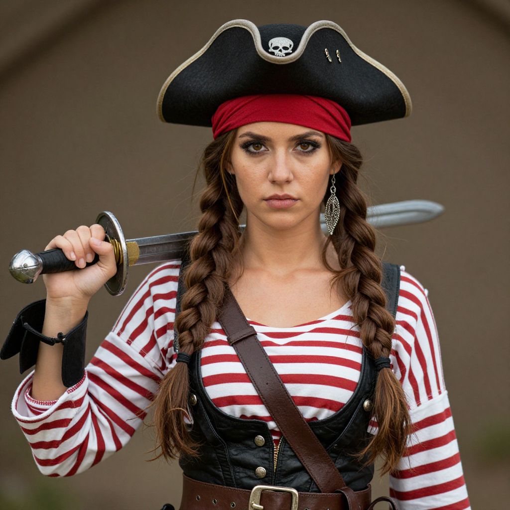 Photograph of a woman dressed as a pirate. She has long, wavy black hair, wears a black tricorn hat with a white skull emblem, and a red bandana. Her outfit includes a black leather jacket, white lace-up corset, and black skirt with white lace trim. She's holding a knife in her right hand, and has a confident expression with bold red lipstick. The background is dark gray.
