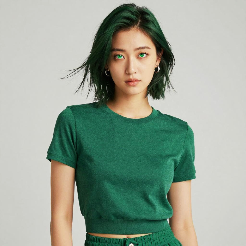 Portrait of a young Asian woman with short green hair and green eyes wearing a fitted green short-sleeve top and green pants. The background is plain light gray, emphasizing her green-themed appearance and casual style.