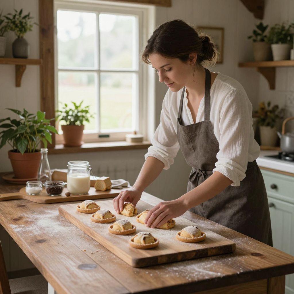 Woman baking in a cozy country farmhouse kitchen, arranging freshly made pastries on a wooden board while surrounded by natural light streaming through a window and potted plants adding warmth to the scene.