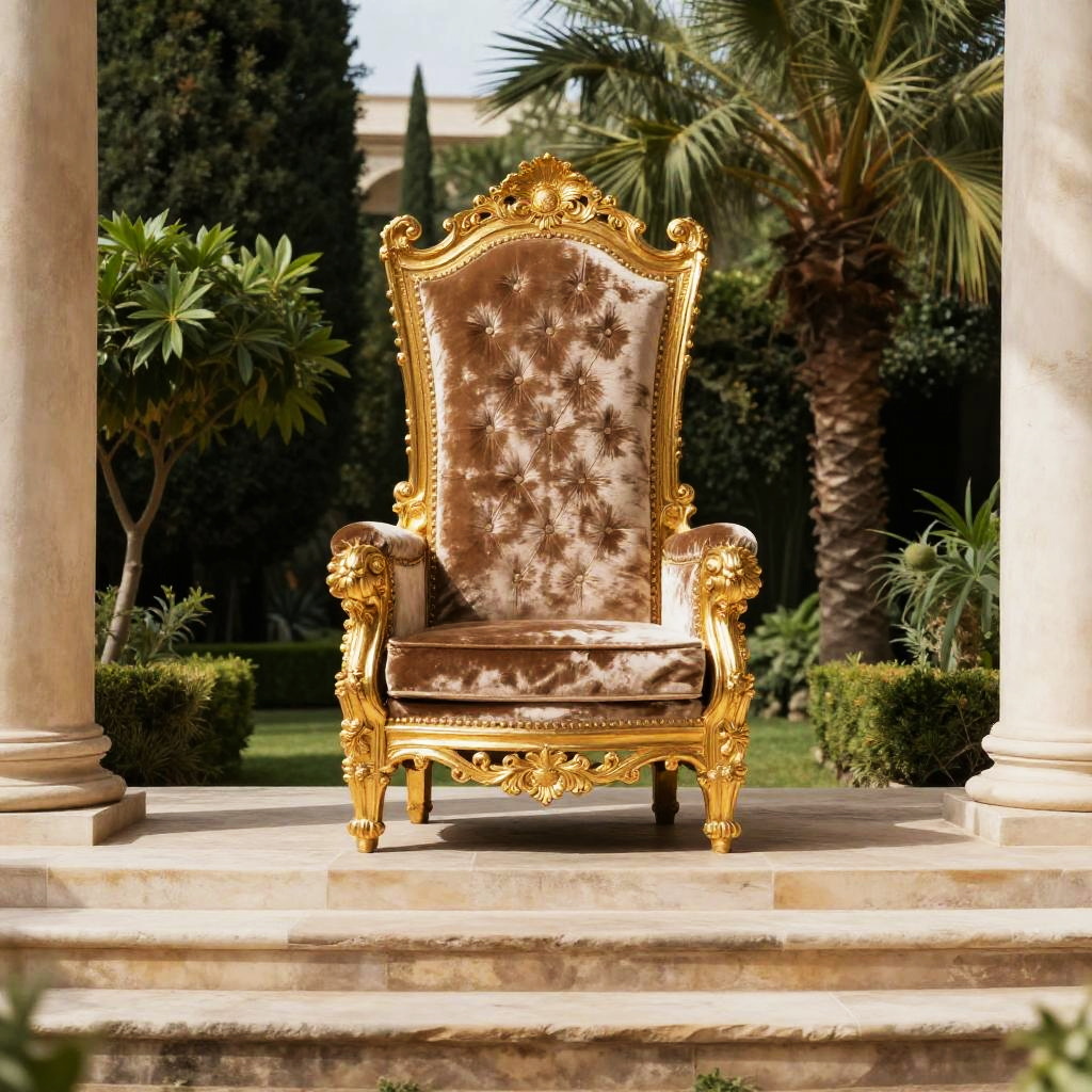 Ancient Roman throne featuring luxurious velvet upholstery and gilded armrests, elevated high with steps leading up, framed by grand pillars and lush greenery of a palace garden.
