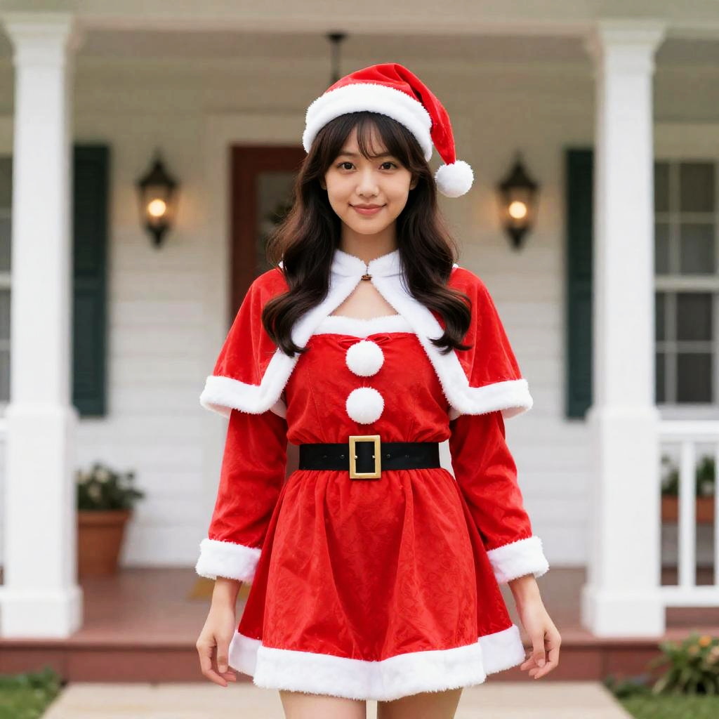 Santa Girl Costume, woman in santa claus costume standing in front of a house