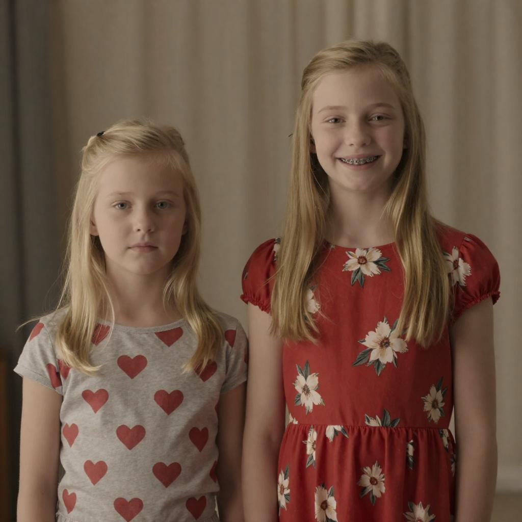 Two young girls standing side by side. The girl on the right has long blonde hair, a red floral dress, and a wide smile showing braces. The girl on the left has shorter blonde hair, a gray shirt with red heart patterns, and a neutral expression. Warmly lit background with blurred curtains.