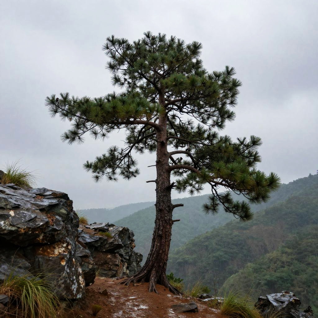 A realistic photograph of a tall pine tree with a strong trunk and thick leaves standing on a rocky cliff. The ground is wet with dirt and grass patches, and the background shows misty mountains under a cloudy sky with light rain.