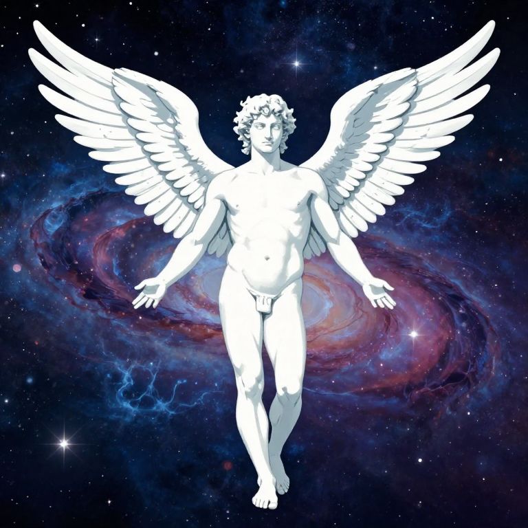 Digital artwork of a white, winged, classical-style angel with curly hair and a muscular, nude physique floating in a starry, cosmic background. The angel's large, detailed wings are outstretched, and its arms are slightly raised. The backdrop features a vibrant, swirling galaxy with hues of blue, red, and purple, creating a dynamic contrast to the angel's bright, white silhouette. The image blends realism with a fantasy style, emphasizing the ethereal and celestial theme.