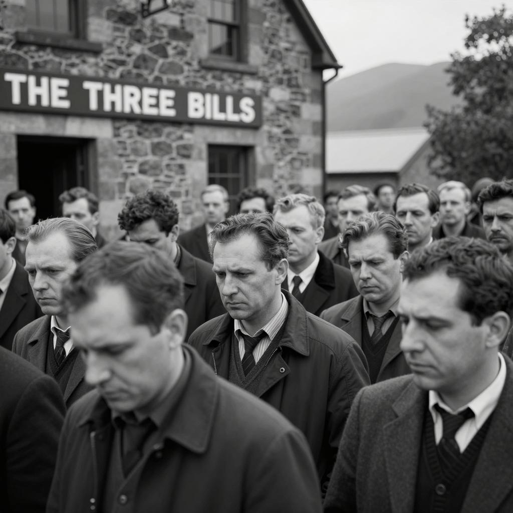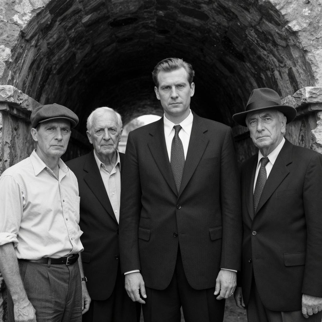 Black and white photograph of four men standing in a stone-walled tunnel. From left to right: man in flat cap and shirt, elderly man in dark suit, tall man in dark suit with white shirt and tie, older man in dark suit with hat. All men have serious expressions. Tall man in center is most prominent. Tunnel has arched opening in background.