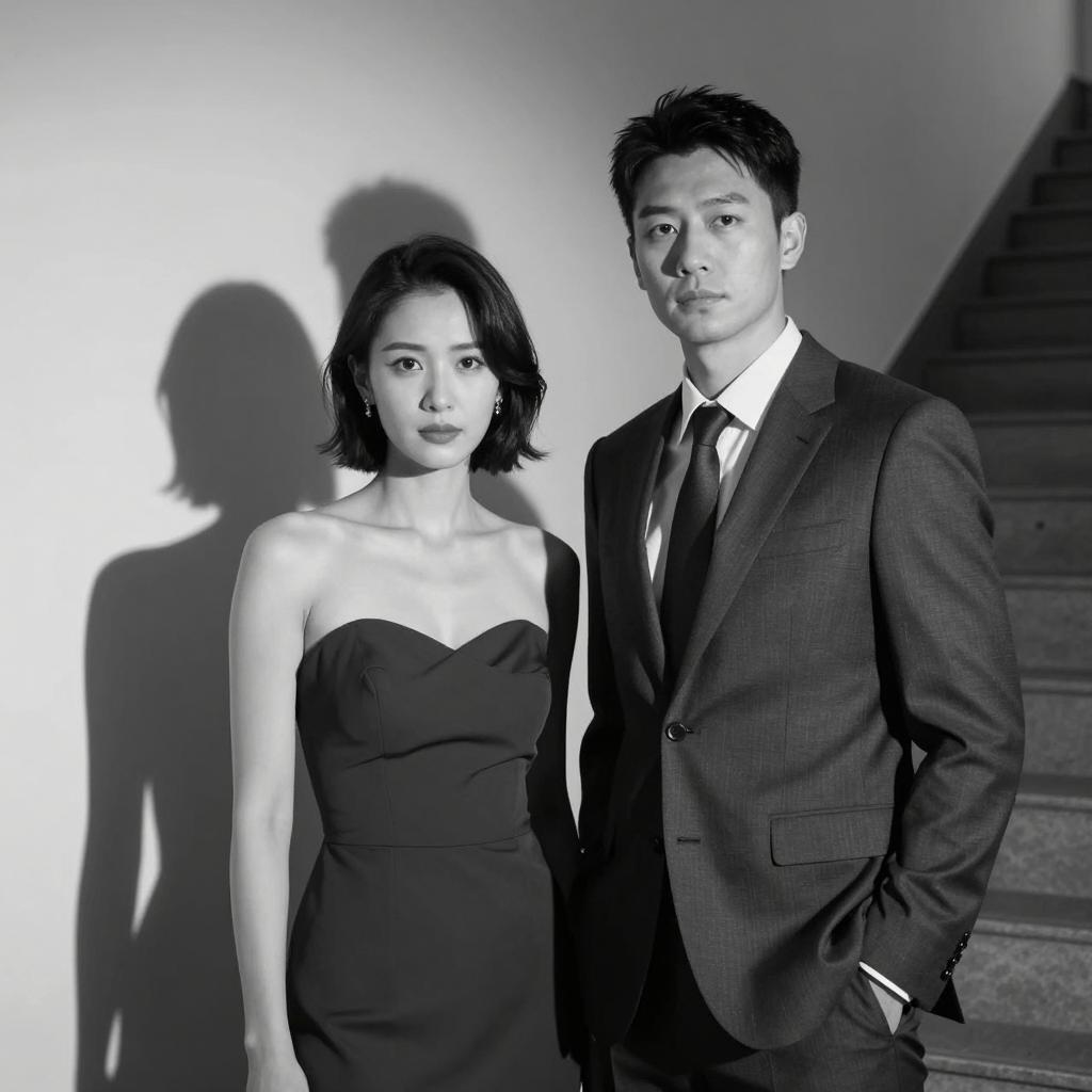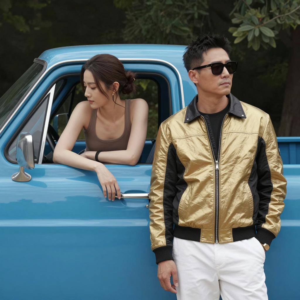 Photograph of an Asian man and woman next to a bright blue vintage pickup truck. The man stands in the foreground wearing a shiny gold and black jacket, white pants, and dark sunglasses. The woman leans out the truck window with her dark brown hair in a bun, wearing a sleeveless brown top and a black bracelet. The truck bed contains blue cloth, and the background features dark green trees. Both subjects have relaxed postures.