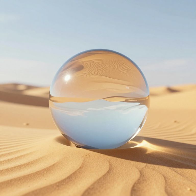 Photograph of a clear glass sphere, half-filled with water, resting on a sandy surface. The sphere reflects the blue sky and creates a ripple effect on its surface. The sand has distinct, wavy patterns from the wind. The bright sunlight casts sharp shadows, enhancing the textures. The background is a clear, gradient blue sky. The image has a minimalist, serene aesthetic with a focus on the reflective and transparent qualities of the glass sphere against the natural, textured sand.