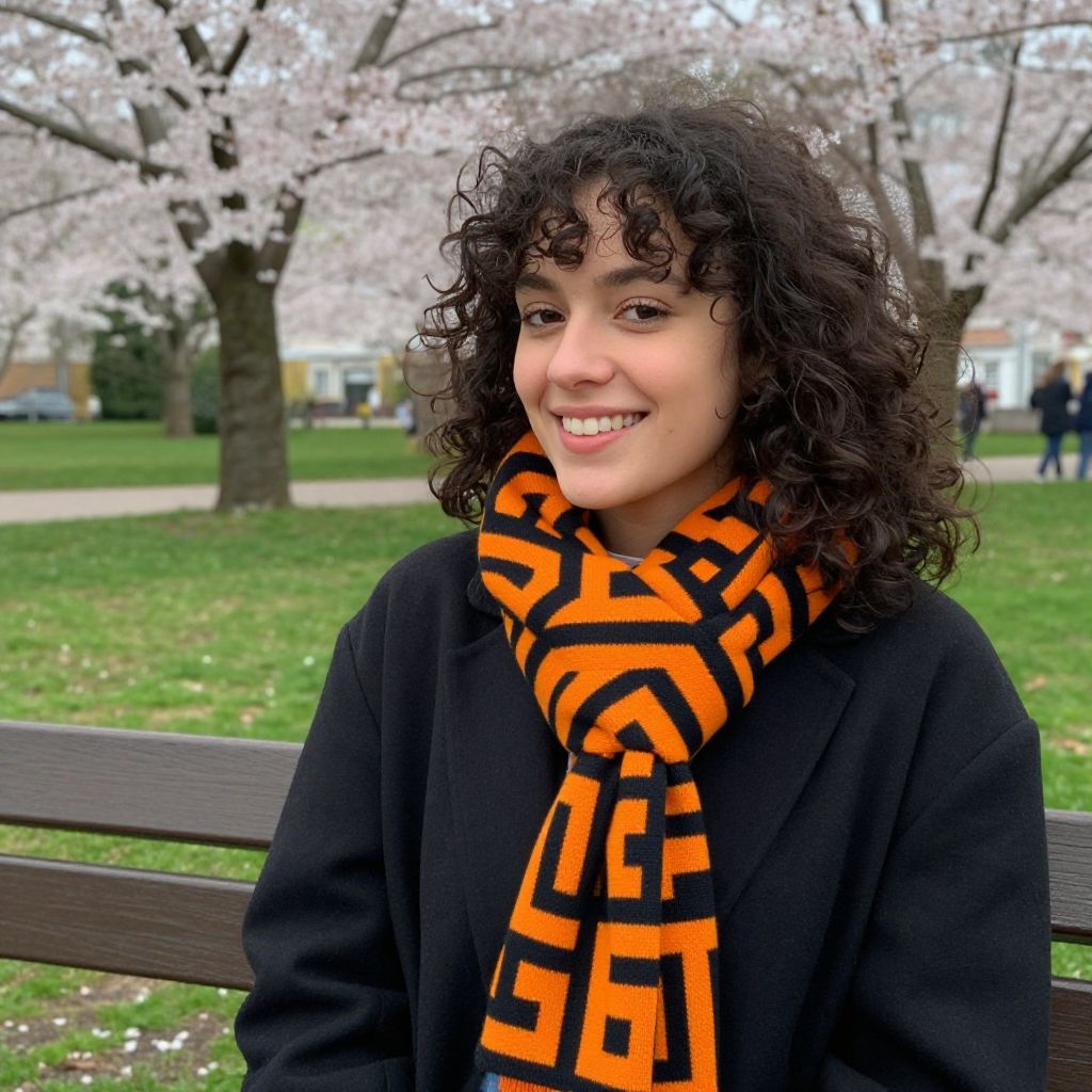 A college student with glasses, slightly messy black hair, and a friendly smile sits on a city park bench during springtime. Wearing comfortable black floral pants with a blooming pattern of pink and purple flowers, she holds a sketchbook. The setting features a small park with trees in full bloom, birds in the sky, and children playing nearby.