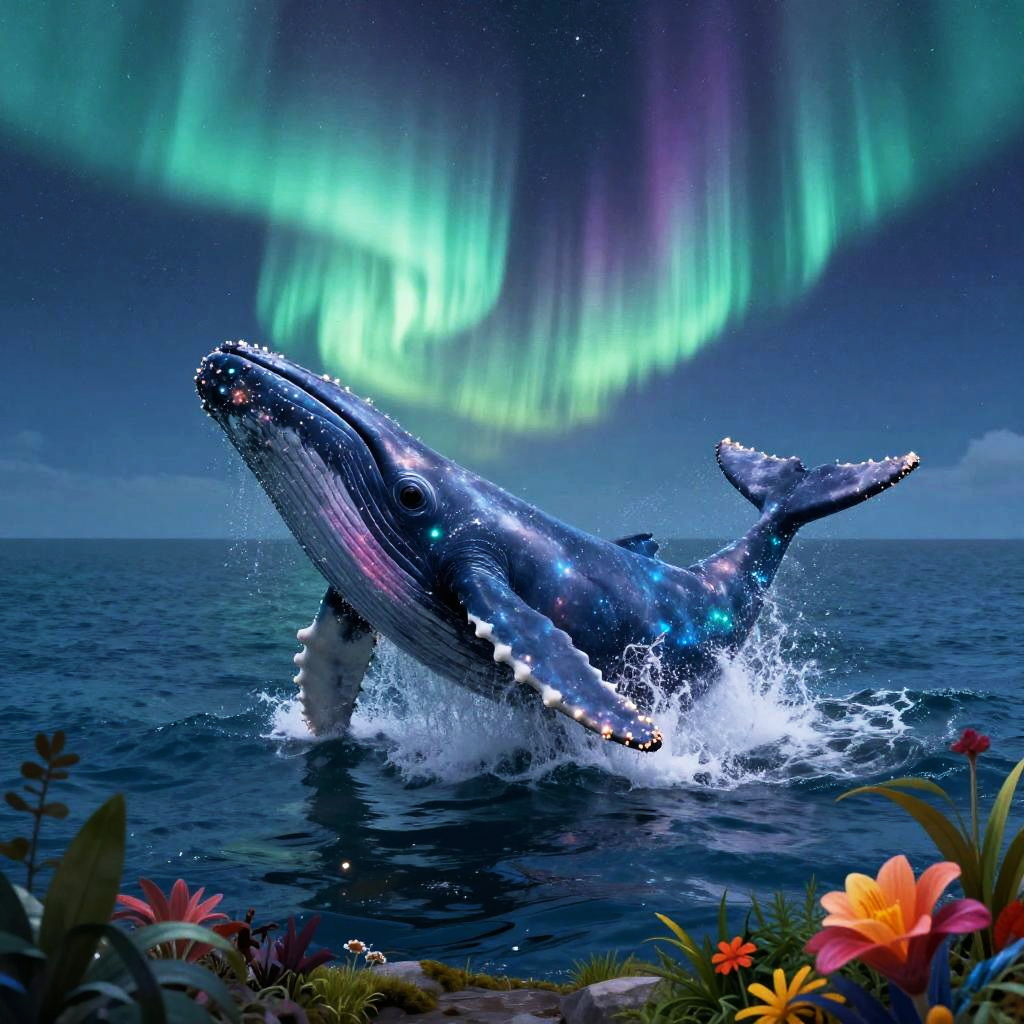 /imagine prompt: a bioluminescent humpback whale breaching in a aurora-lit polar sea under a starry night, surrounded by lush vegetation and vibrant colors, captivating illustration style, wild vibes, dynamic warm light, epic image, cinematic, highly detailed, 8k, high quality, by J. M. W. Turner