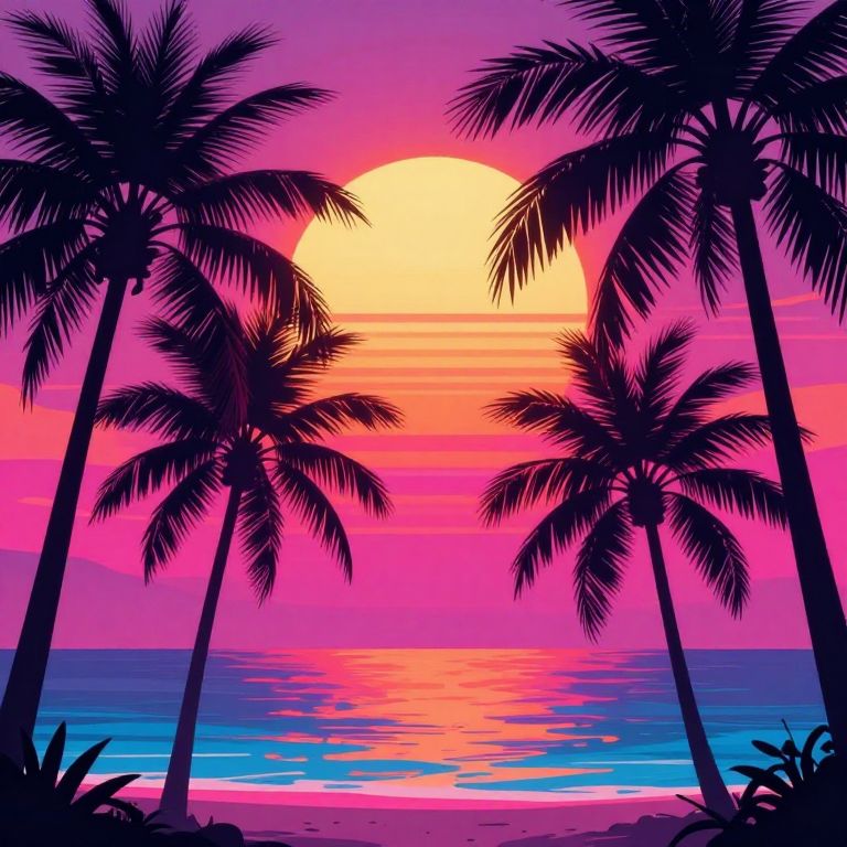 The image captures a vibrant, tropical scene bathed in a neon, 80s-inspired aesthetic. A large, glowing sun dominates the sky, casting a warm, radiant light over the scene. Silhouetted palm trees, their fronds reaching upwards, frame the image, their dark outlines contrasting sharply with the bright, colorful background. The sea below reflects the sky's hues, with shades of pink, orange, and blue blending seamlessly. The overall composition is dynamic, with the sun and palm trees creating a sense of depth and perspective. The interplay of colors and shapes creates a sense of movement and energy, evoking a sense of adventure and escapism.