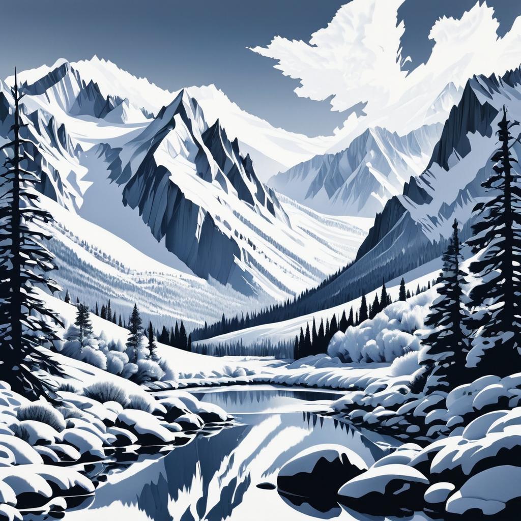 Detailed illustration of snowy mountains by Ansel Adams, showcasing a serene landscape.