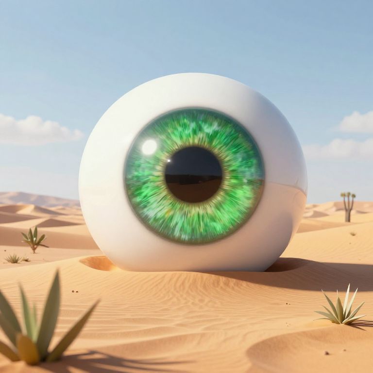 In a surreal 3D-rendered desert landscape, a colossal human-like eye emerges from the sand, its vibrant green iris and black pupil mirroring the surrounding ecosystem, blending digital artistry with natural realism.