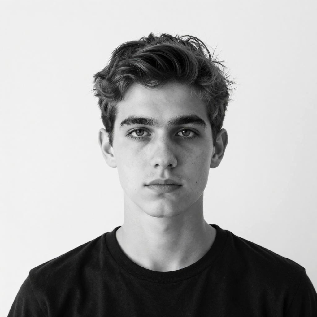 Minimalistic black and white romantic portrait of a young poet, curly hair, inspired by William Blake, elegant and refined, stark contrasts