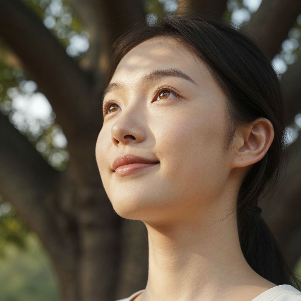 Photograph of an Asian woman with fair skin, dark hair, and brown eyes, looking upward with a soft smile, sunlight filtering through tree branches in