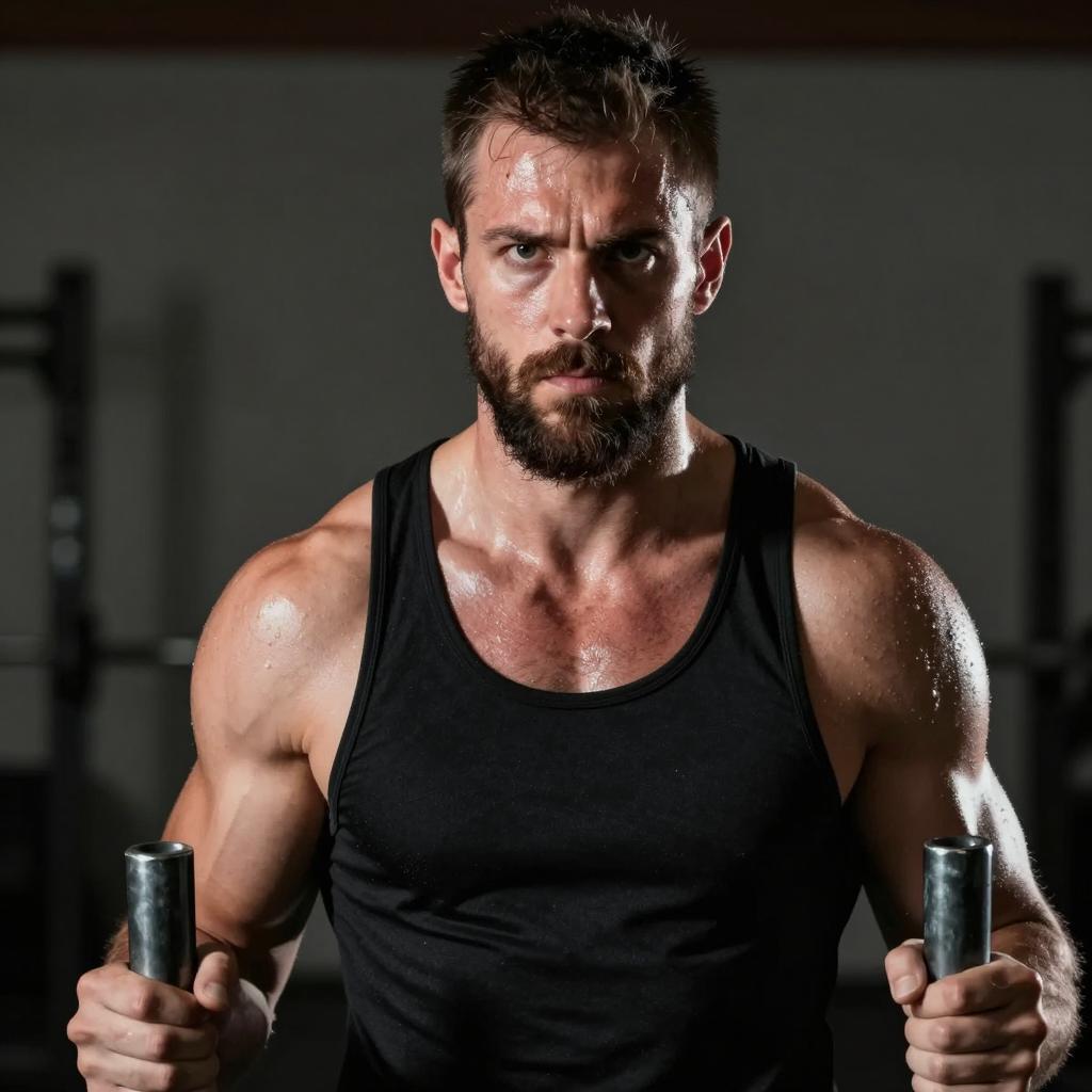 Three people. A muscular man in a blue tank top and black cap stands in the center with arms crossed, smiling. A woman with blonde hair in a purple shirt with a Nike on the left, smiling at him. Another woman with brown hair in a red, unzipped shirt on the right, looking at him. All three stand close together against a plain background.