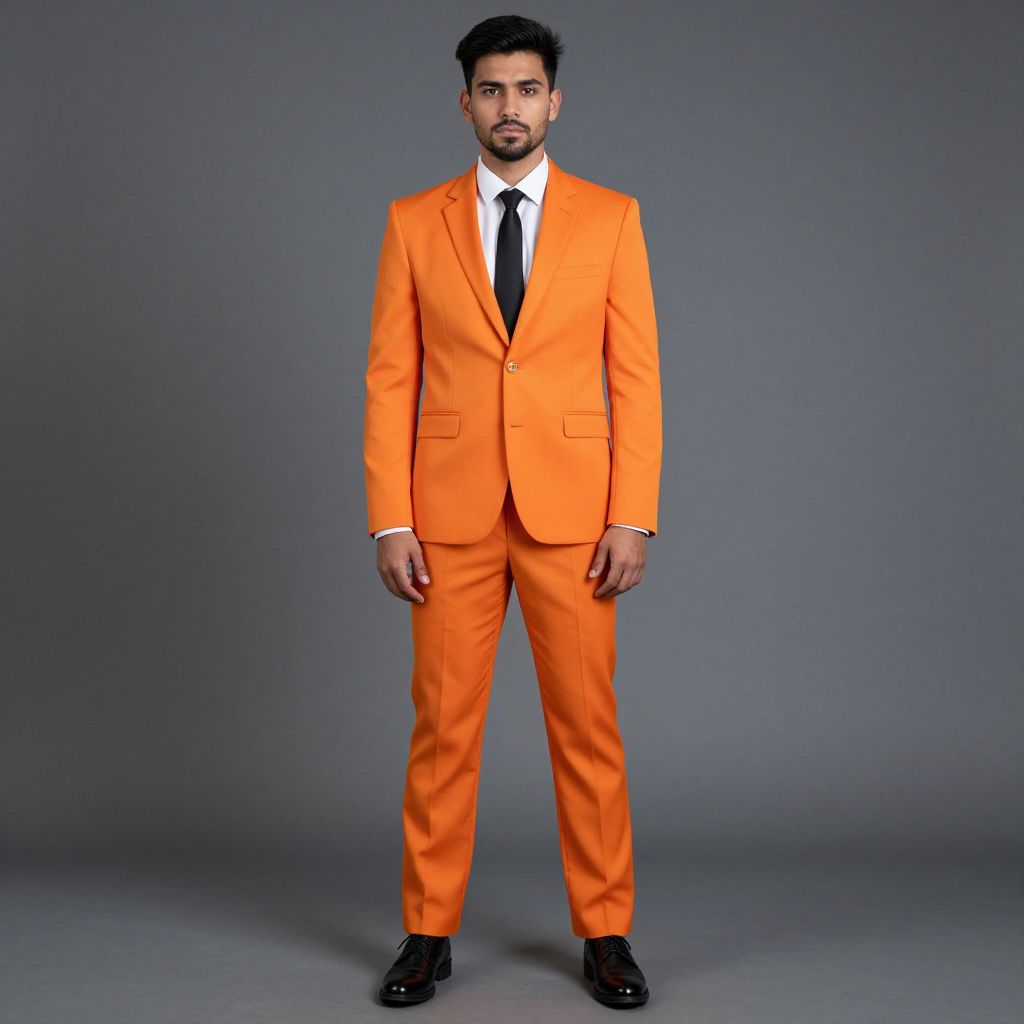 Opposuit orange costume suit, 1boy, male focus, solo, suit, formal, standing, facial hair, jacket, black footwear, full body, pants, orange pants, black hair, necktie, shirt